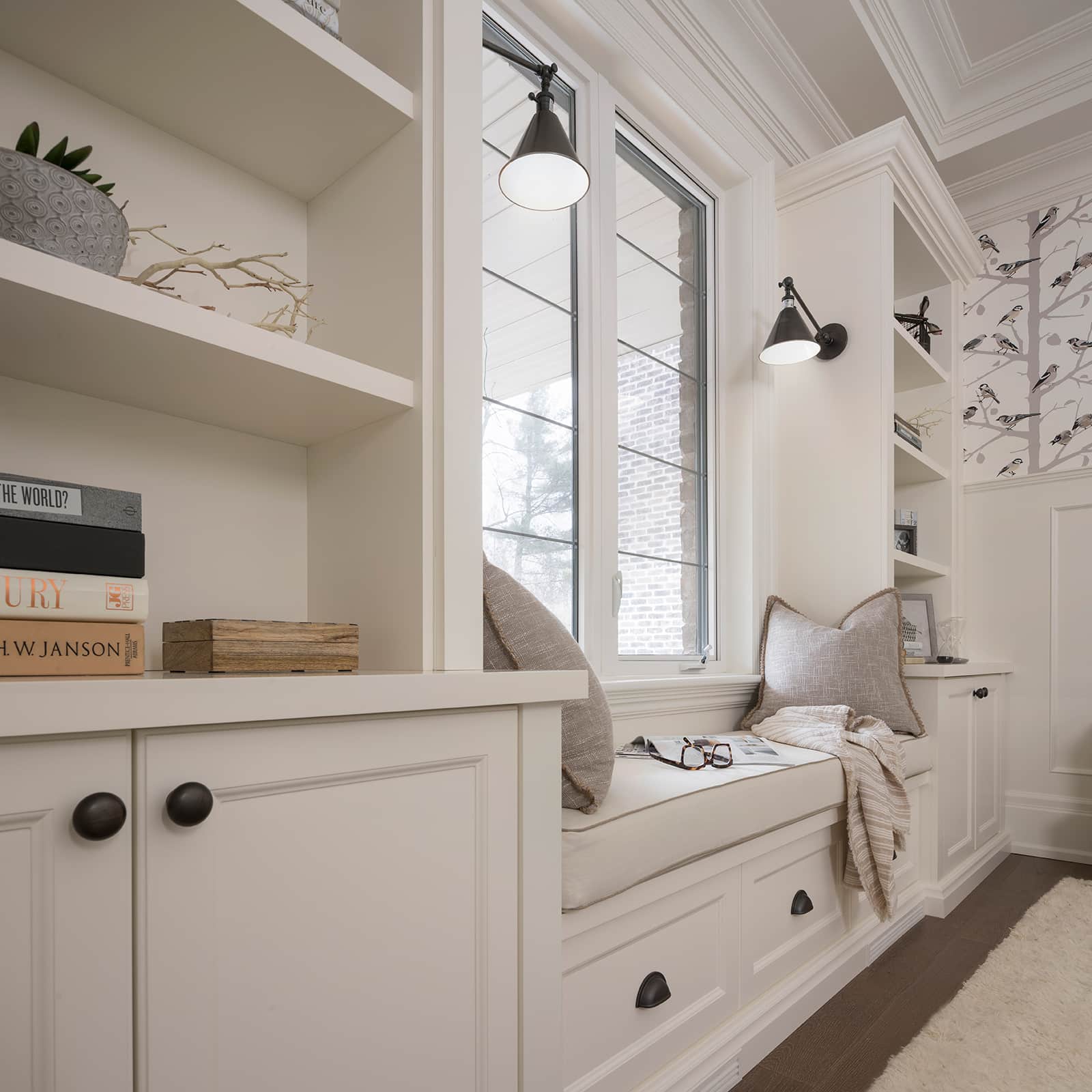 Additional design elements, including lighting, fabric and textures, add a cozy feel to the window seat.