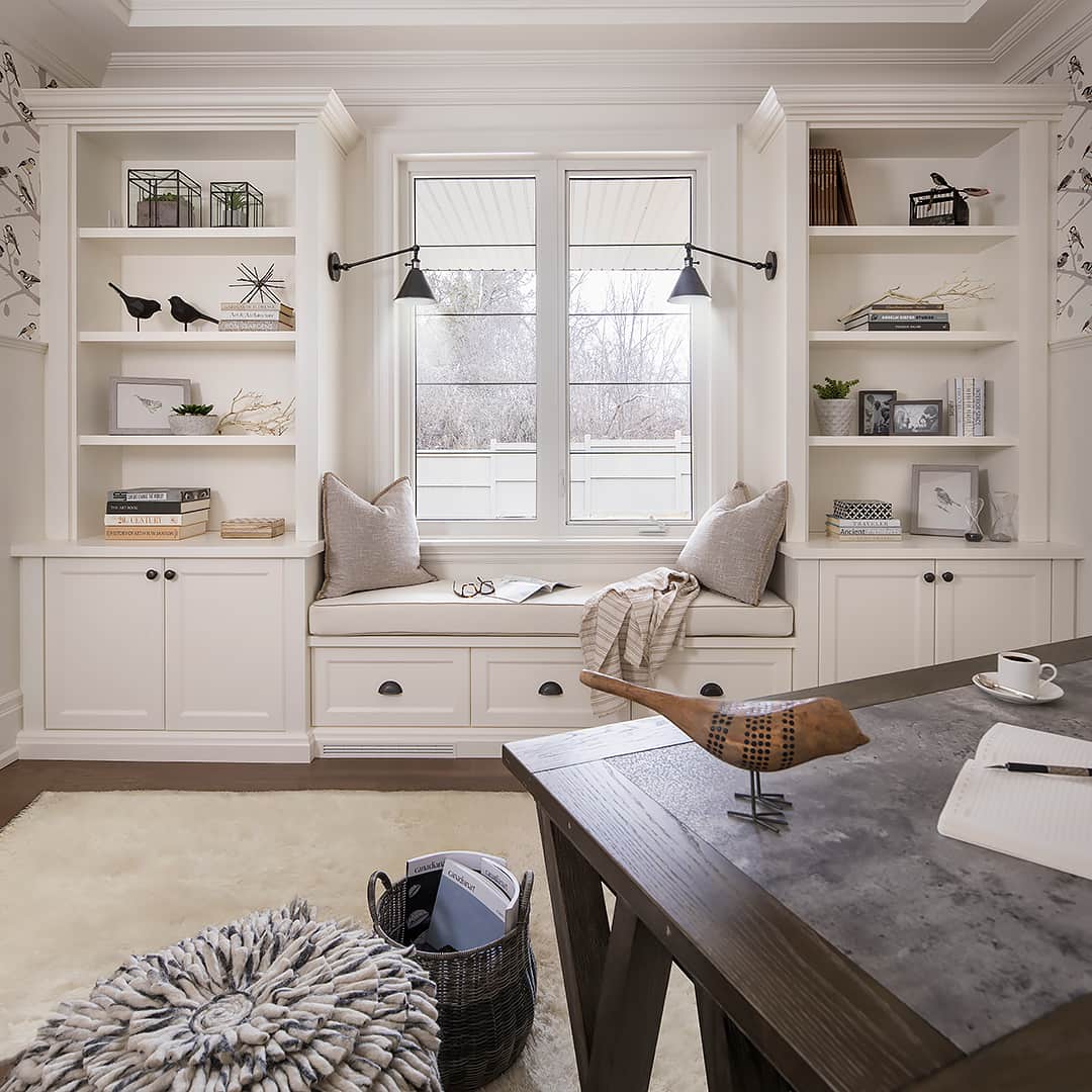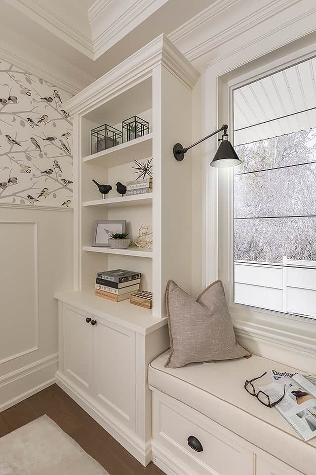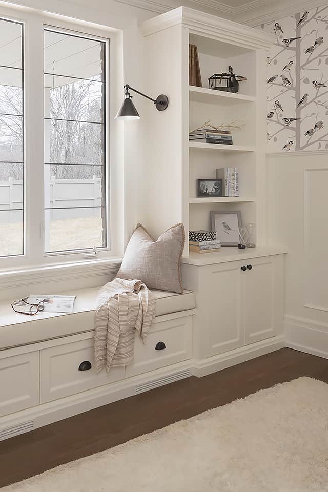 The window is framed, and balanced, by two books cases, and the built-in seat offers a perfect spot to read with natural lighting.